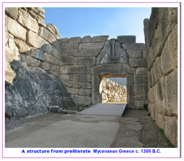 Out of that, of course, eventually came a sense of art and architecture that could be passed down in great detail to future generations and in turn modified generation after generation, so that by 430 B.C, an extremely detailed tradition would exist, such as we see evidenced in the design of the Parthenon that was far more sophisticated than the rough stone structures of preliterate Greece, one of which is shown below, and which is not much different from Stonehenge.
