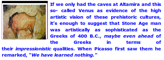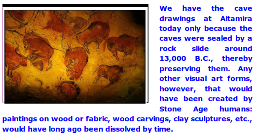 There isn't any doubt in anybody's mind today that high aesthetic capability is a certain indicator of high native intelligence. Fortunately, despite the ravages of time, certain non-stone art forms have been miraculously preserved (such as the cave drawings in Altamira and other European caves which date to some 18,000 to 35,000 years ago—Stone Age Europe.)