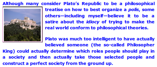 Of course, Plato could have been an artistic fool who had no idea how the real world operated, but all we know about him argues against that. What makes the satire even more complete is that Plato was actually given a chance to do that by one of the Greek kings and failed miserably. Perhaps he had a bit of street theater in him as well.