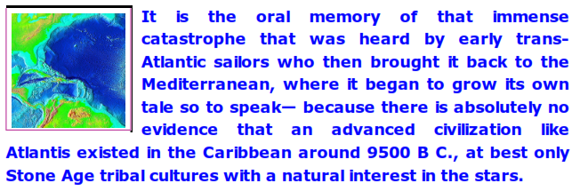 I have no doubt that oral tales would have abounded throughout the Caribbean from 9500 B.C. on, but those tales would have been so mangled by their transmission over that length of time that God knows what would have come through intact except some very basic facts and names (Atlaxxx, fire, destruction, sinking, flood).