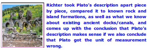 Evidence of this can be seen in Richter's conclusion that Plato's geological description of Atlantis echoes that of other island/seaside/harbor/canal descriptions of preliterate seaports.