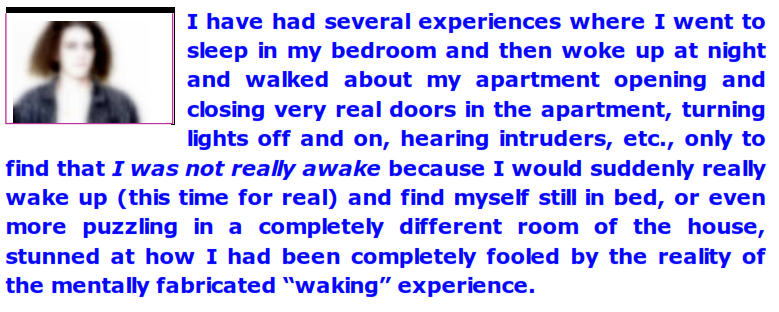 People who have been abducted have reported that their alien visitations were as real as everyday life right down to the last nail in the floor (let’s put aside for a minute the “clues” I’ve mentioned that indicate that it was a psychic reality).