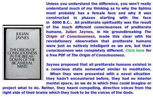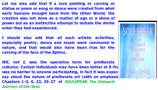 Jaynes goes on to say that those directive voices also took the form of the voice of the Muse and were the origin of oral poetry, the dominant art of all preliterate cultures. I would add to that by saying that similar nonverbal visions were the origin of their visual art as well as their music and dance. That is why in Greece, for example, the very earliest reference to the Muse was plural: the Muses.