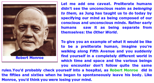 Preliterate man experienced his powerful unconscious as the Other World, the world of voices and visions and Gods. Because of that, the spiritual objective of preliterate humans was to experience that Other World and then imitate it in their art and actions.