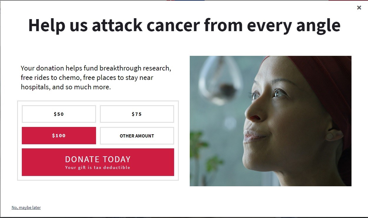 We shall begin with their home page: cancer.org . About five seconds after clicking the link and entering the suite, we are greeted by a pop-up window that solicits our money: