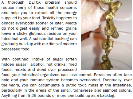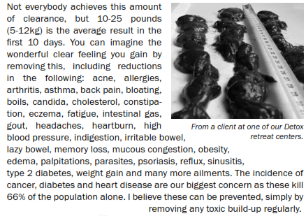 I have sometimes seen people experience between 20 and 30 pounds of impactions removed during the standard 10 days on my DETOX program . I will now outline how it works and why it is simply the quickest and easiest way to improve general health and extend your quality of life .