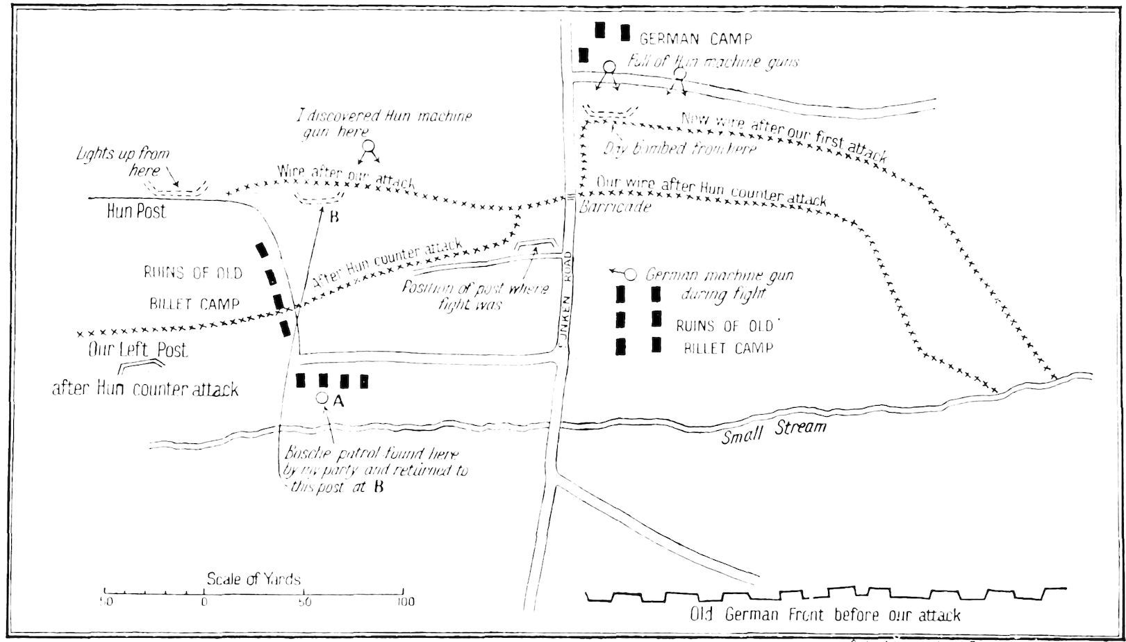 Aug. 15. Started to wire from the barricade towards the right in order to join up with Day, who was working from the other end. Got to our first post but could get no farther, as there was a strong German post across our line. Day bumped into this from the other side, and was driven off with two casualties. I was lying down listening when the Huns fired into Day and was surprised to find I was not ten yards away from them. They sent up a light, and I could see about ten of them as plainly as daylight, all looking along their rifles. I dropped a bomb into them and departed, but if we had known they were there we could have collared the whole lot.