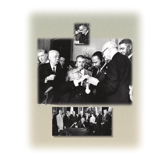 Brown changed the temper of the times, and led to national civil rights legislation, especially during the presidency of Lyndon B. Johnson (inset top).