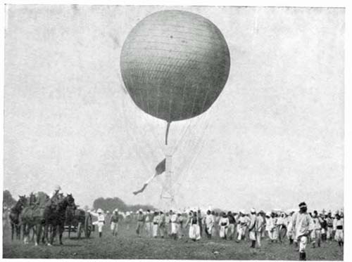 IT was to see the war balloon go up that I planned with a youthful wag of a Scot to rise at five o’clock one morning and walk out to the French lines before breakfast. He came to the roof and got me up, and we passed through the ruined streets, over the fallen bricks and mortar, to the outer gate, the Bab-el-Sok. Arriving in the open, the balloon appeared to us already, to our surprise, high in the air; and on the straight road that divided the French camp we noticed a thick, lifting cloud of brown dust. Lengthening our stride we pushed on as fast as the heavy sand would allow, passing the camp and overtaking the trail of dust just as the last cavalry troop of the picturesque French army turned out through an opening in the wire entanglements which guarded the town. General Drude did not inform correspondents when he proposed an attack.