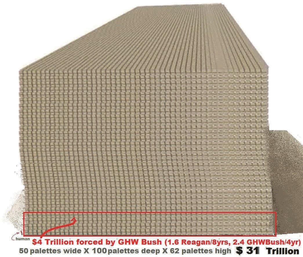 in $100. bills only. Solid mass $31Trillion worth of $100 bills above. See human, ~1/16 inch high, lower left of humongous pile ( with blue pants and a red shirt.)