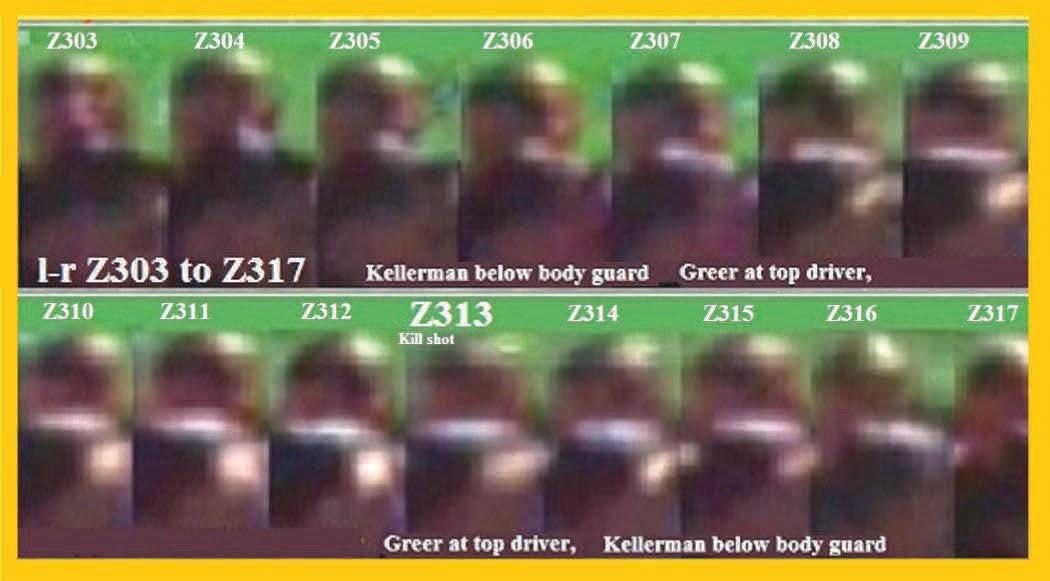 Moorman captured the .45 being retrieved by Greer while Kellerman is shielding his face with the blue trip folder to avoid being burnt by the hot gases of the kill shot discharge. So we have two views identifying the weapon that killed JFK from ~4 feet away showing the muzzle of the flat topped shiny weapon pointed at JFK. Also the horizontal blur in Greer's head at Z313 is caused by the jolt of his .45 moving his head back to make it copy wider in that frame only while JFK’s head explodes in the same (1/40 second exposure of) frame Z313. This is due to the kick of his .45 expanding the apparent width of his head, and the time coincidence nails Greer as JFK’s assassin.