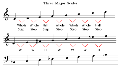 These major scales all follow the same pattern of whole steps and half steps. They have different sets of notes because the pattern starts on different notes.