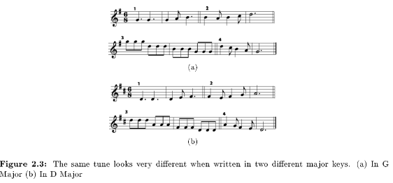 Listen to this tune in G major18 and in D major19. The music may look quite different, but the only difference when you listen is that one sounds higher than the other. So why bother with different keys at all? Before equal temperament20 became the standard tuning system, major keys sounded more different from each other than they do now. Even now, there are subtle differences between the sound of a piece in one key or another, mostly because of differences in the timbre21 of various notes on the instruments or voices involved. But today the most common reason to choose a particular key is simply that the music is easiest to sing or play in that key. (Please see Transposition22 for more about choosing keys.)