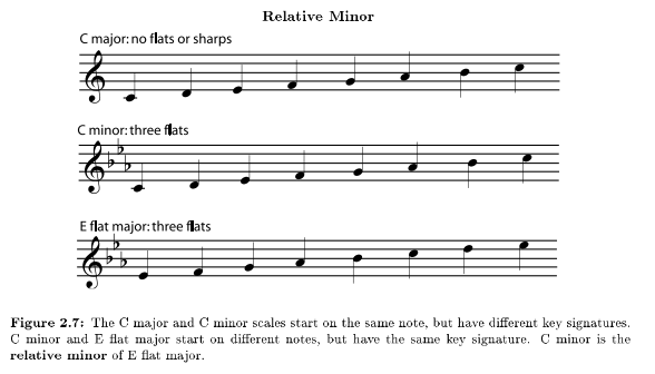 It is easy to predict where the relative minor of a major key can be found. Notice that the pattern for minor scales overlaps the pattern for major scales. In other words, they are the same pattern starting in a different place. (If the patterns were very different, minor key signatures would not be the same as major key signatures.) The pattern for the minor scale starts a half step plus a whole step lower than the major scale pattern, so a relative minor is always three half steps lower than its relative major. For example, C minor has the same key signature as E at major, since E at is a minor third higher than C.