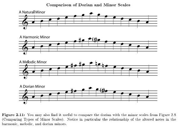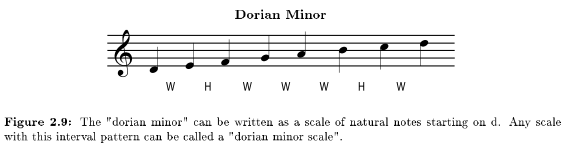 Major and minor scales are traditionally the basis for Western Music37, but jazz theory also recognizes other scales, based on the medieval church modes38, which are very useful for improvisation. One of the most useful of these is the scale based on the dorian mode, which is often called the dorian minor, since it has a basically minor sound. Like any minor scale, dorian minor may start on any note, but like dorian mode, it is often illustrated as natural notes beginning on d.