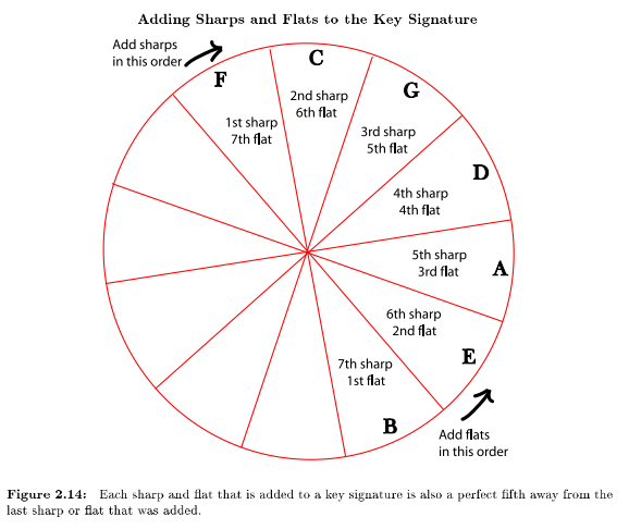 The circle of fifths gets its name from the fact that as you go from one section of the circle to the next, you are going up or down by an interval (Section 1.3) of a perfect fifth (Section 1.3.3.1: Perfect Intervals). If you go up a perfect fifth (clockwise in the circle), you get the key that has one more sharp or one less at; if you go down a perfect fifth (counterclockwise), you get the key that has one more at or one less sharp. Since going down by a perfect fifth is the same as going up by a perfect fourth (p. 14), the counterclockwise direction is sometimes referred to as a "circle of fourths". (Please review inverted intervals (Section 1.3.4: Inverting Intervals) if this is confusing.)