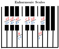 Notice that although they look completely different, the scales of F sharp major and G at major (numbers 5 and 6) sound exactly the same when played, on a piano as shown in Figure 2.16 (Enharmonic Scales), or on any other instrument using equal temperament42 tuning. If this surprises you, please read more about enharmonic43 scales.