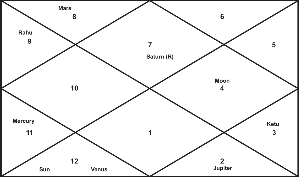 Both, Mercury and Saturn, were then in retrograde motion, and the latter was situated in Libra, its sign of exaltation. The Moon, in the mutual- kendra situation with Jupiter occupying its own sign in the 4th house from the lagna, gave rise to the favourable Kesari yoga and the Amla yoga which kind of yogas generally do not operate up to their full potential if the birth is in Lagna-sandhi.