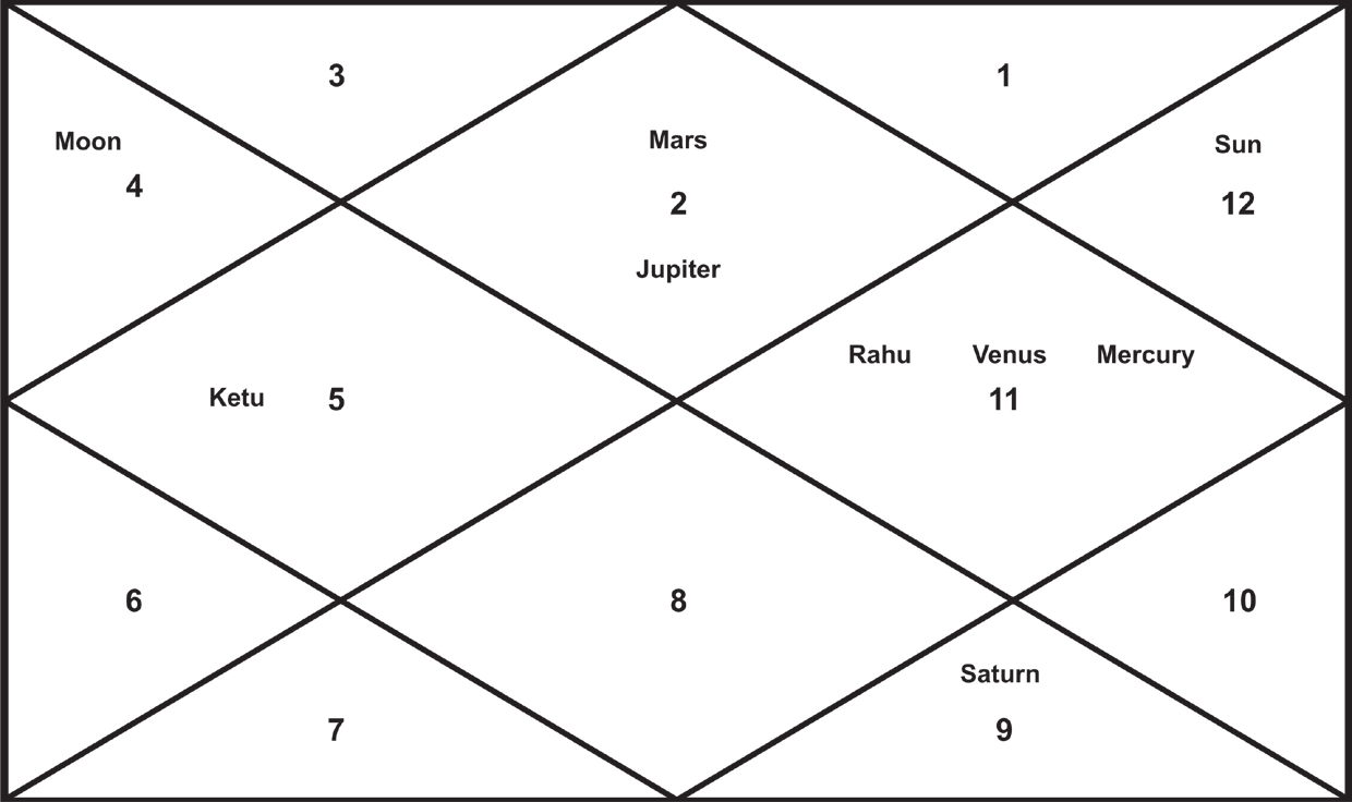 Saturn situated in the 5th house, even if in its own sign but not aspected by Jupiter, makes one long for a son. The lord of the 5th house in adverse relationship with the karaka of the 5th does not give a son, moreover, by occupying the 6th house from the lagna and the Moon, Jupiter does not protect the 5th house and the planet situated in the 5th. Therefore, this native is not blessed with a son. In its own antra-dasa in its own dasa Saturn made this native quit his job and seek his fortune abroad. A weak retrograde planet in the course of its dasa invariably brings about a radical change in one’s life and outlook; it even makes the person give up all previous gains including residence and the country of birth. Here, Saturn is afflicted by Ketu. Rahu situated in the 11th house is not considered badly placed but Ketu situated in the 5th house in the sign ruled by its bitter enemy and in the company of its bitter enemy certainly compels a person to act in an unreasonable manner and invite
