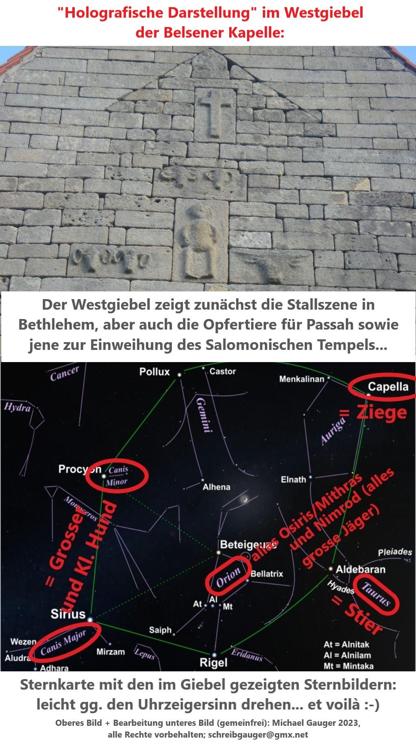 Wir hätten – neben Osiris/Orion im «Groβen Bel» - mit Sirius und Isis im «Kleinen Bel» also die gesamte göttliche Dreieinigkeit der Ägypter abgebildet. Wobei wir den Mythos von den Templern als «Geheimgesellschaft» vorher zwar schon etwas geradegerückt haben Nichtsdestotrotz finden wir an der Belsener Kapelle mehrfach deutbare (okkulte) Symbole, mutmaβlich von Templern. Aber aus anderer als «geheimbündlerischer» Absicht, siehe dazu «Absicht von okkulten Symbolen» auf S. 17.