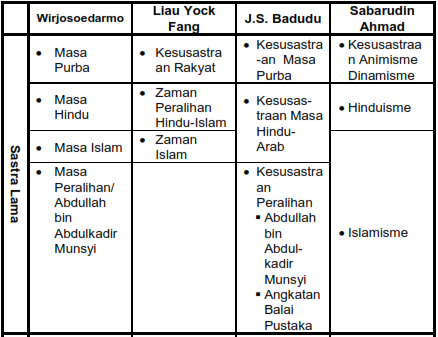 Pembagian di atas menunjukkan perbedaan para ahli dalam menetapkan periode-periode dalam kesusastraan Indonesia klasik. Dalam buku ini pendapat yang digunakan adalah pendapat Liau Yock Fang. Pendapat ini lebih konkret menampilkan kesusastraan Indonesia klasik karena didasarkan pada bukti-bukti sejarah berupa naskah-naskah klasik yang masih bisa ditelusuri keberadaannya. Pembagian ini juga memisahkan kesusastraan masa peralihan dalam bab tersendiri.
