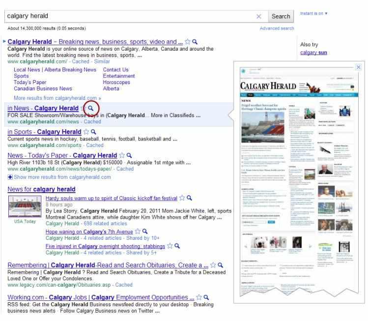 Also, in 2010 Google added a new feature to their list of indexed websites. It is knownas Google’s Instant Preview. When someone does a search for something in Google, the results will appear and they will see a very small magnifying glass icon (as shown in the red circle below) beside the title of the website. Clicking on the icon allows people to quickly take a peek at a website before they decide if they want to actually visit that site or not.