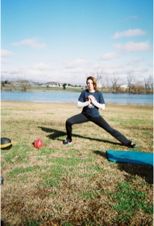 Stand with your hands together, feet shoulder width apart, looking straight ahead. Lunge to one side and return to start. Lunge to the other side. That’s 1 repetition.