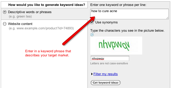 What you need to do is enter in a basic (core) keyword phrase that describes your market, topic or a product you are planning to promote.
