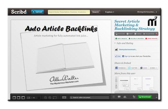 With article marketing no longer being as effective as it once was (it is still quite effective though, just not as much as years before), the latest type of site that is being used by internet marketers and article marketers everywhere is the document sharing site.