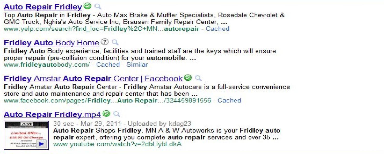 Check out the image below to see how having content on third-party sites can get your business on the first page of Google. For the phrase auto repair Fridley, three of the last four sites that show up on page one are from third-party sites; Yelp, Facebook, and YouTube.