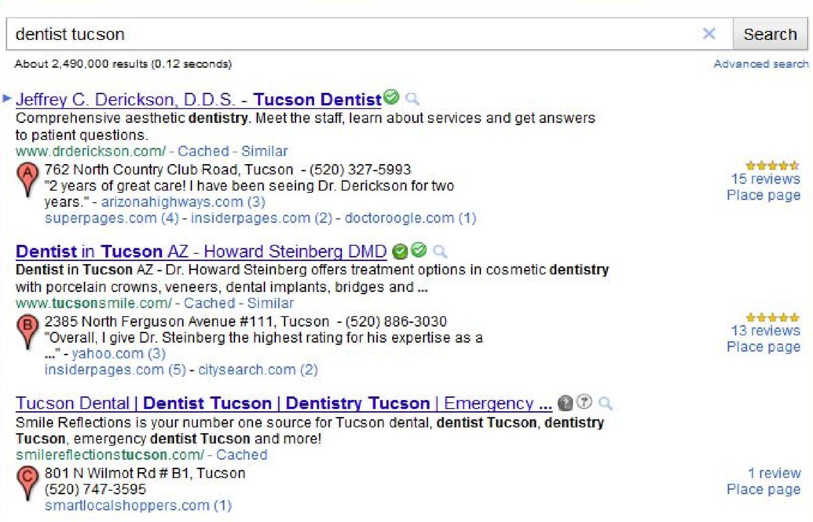 Over 75% of all searches are related to local products and services. So when someone uses Google to find a dentist in Tucson, the very first results that are shown on the page are Google Places listings of dentists that are located in or near Tucson.