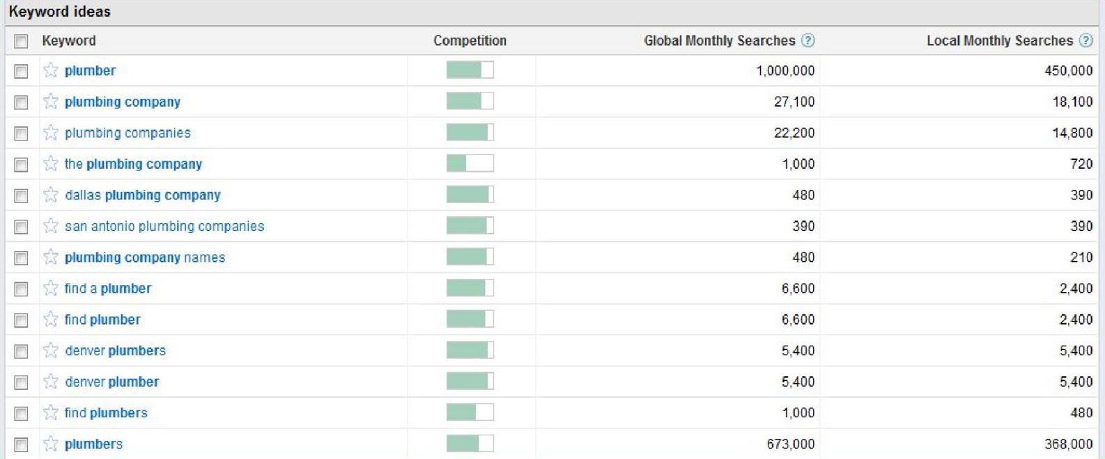 Google found 100 terms related to plumber and plumbing company. In looking at the list above, you can see the first column next to the keyword is Competition. This refers to the amount of competition among paid advertisers, and can give you some insight into how many businesses may be using a certain phrase to get more customers.