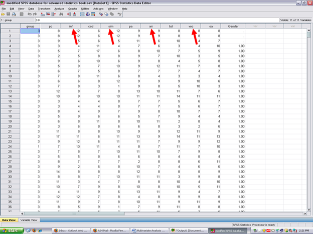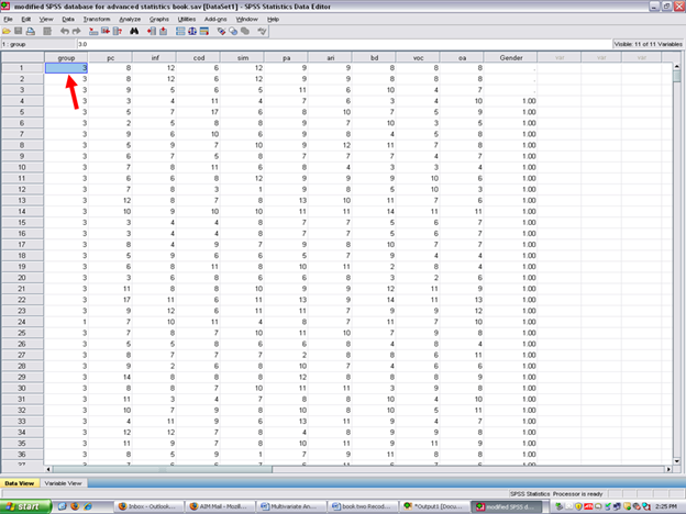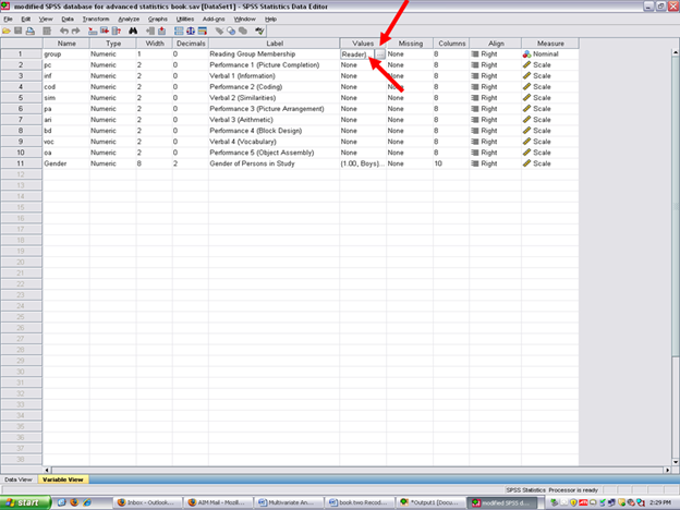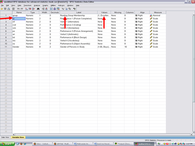 After clicking on Variable View, the following screen will appear: Arrows have been placed toward the name of the independent or grouping variable; toward the label assigned to this variable; and then toward the values of each group.