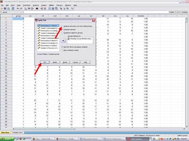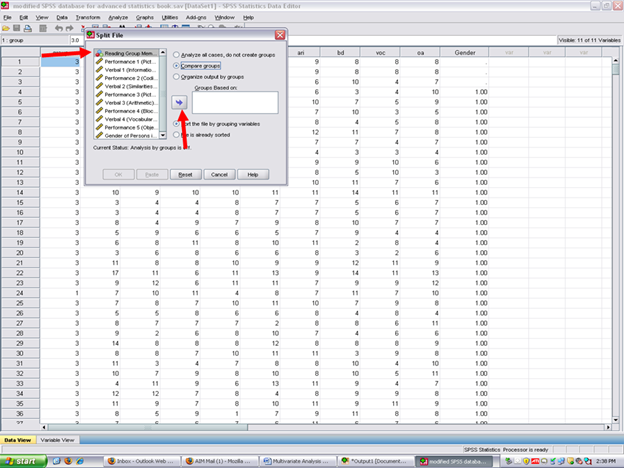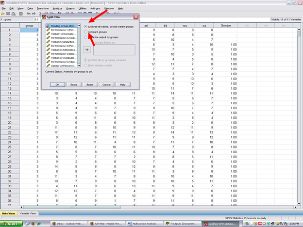After clicking on the split file icon, the following screen will appear: You will note that the Analyze all cases, do not create groups is checked. This value is the default for SPSS as all cases are analyzed, unless otherwise specified. To obtain measures of normality for each of the three reading groups, the Compare groups button will need to be clicked.
