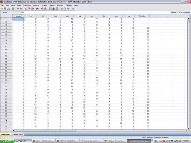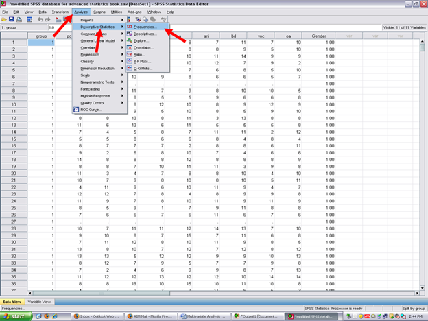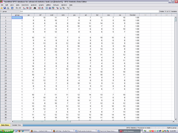 In this set of steps, readers will calculate a multivariate analysis of variance procedure, following the determination of the extent to which data for the dependent variables reflect normal distributions. Although a parametric statistical procedure requires that its data be reflective of a normal curve, the multivariate analysis of variance procedure is regarded as being sufficiently robust that it can withstand most violations. For detailed information regarding the assumptions underlying the multivariate analysis of variance (MANOVA) procedure, readers are referred to the Hyperstats Online Statistics Textbook at http://davidmlane.com/hyperstat/ ; to the Electronic Statistics Textbook (2011) at http://www.statsoft.com/textbook/ ; or to Andy Field’s (2009) Discovering Statistics Using SPSS at http://www.amazon.com/Discovering-Statistics-Introducing-Statistical-Method/dp/1847879071/ref=sr_1_1?s=books&ie=UTF8&qid=1304967862&sr=1-1