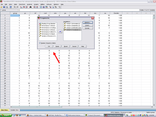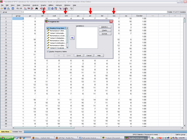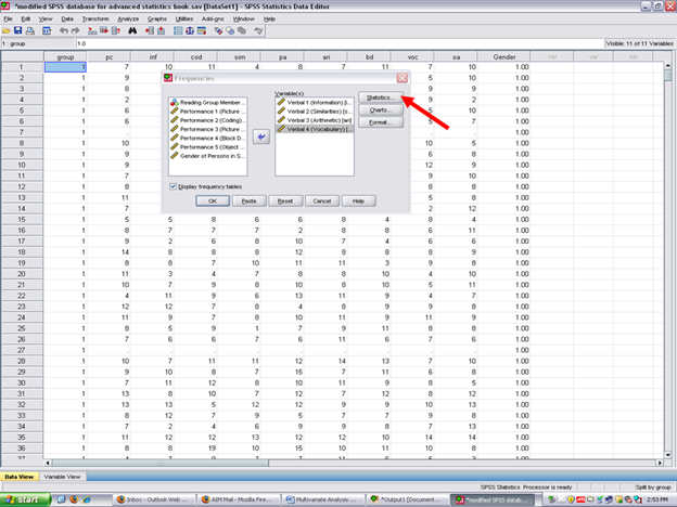 After clicking on frequencies, the following screen should now be present. Remember that the dependent variables in this example are Verbal 1 through Verbal 4 (i.e., inf, ari, voc)