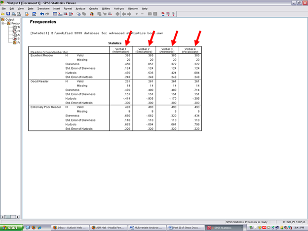 In the columns to the right of the three reading groups are the skewness and kurtosis values for the four dependent variables.