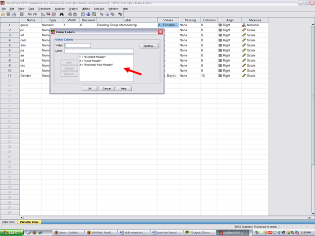 By clicking on variable view, you can see how many groups of students are present in the reading group variable; the names of the groups; and the numbers which have been assigned to each group.