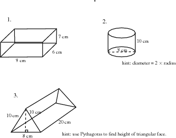 If you examine the prisms in Figure 8.1, you will see that each face of a prism is a simple polygon. For example, the triangular prism has two faces that are triangles and three faces that are rectangles. Therefore, in order to calculate the surface area of a prism you simply have to calculate the area of each face and add it up. In the case of a cylinder the top and bottom faces are circles, while the curved surface flattens into a rectangle.