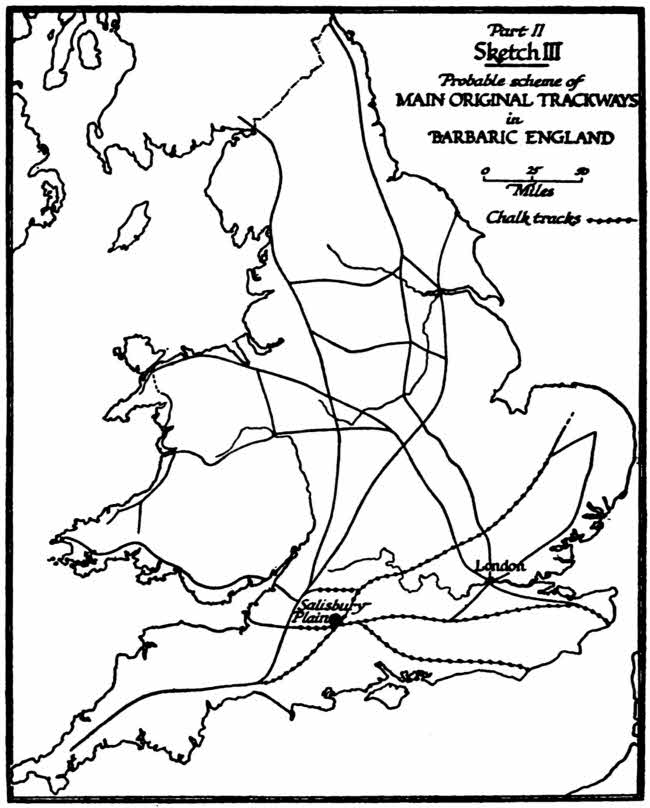 Part II, Sketch III, Probable scheme of MAIN ORIGINAL TRACKWAYS in BARBARIC ENGLAND