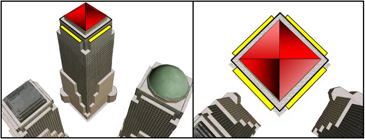 E; TALL BUILDING SEEN FROM ABOVE ROOF IS MUCH BIGGER THAN BASE