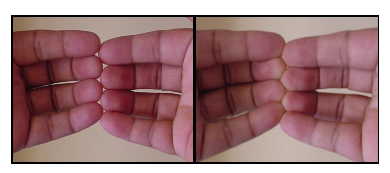 6. Similarly, when finger tips of both hands are joined opposite to each other on a plane (left below) gaps remain between finger tips as they are round shaped. However, when fingers are pressed towards each other the gaps vanish and the finger tips attain half hexagon shape.