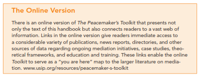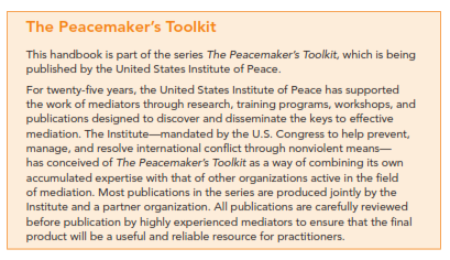 “Track I” is used here to describe any activities that bring the parties to a conflict into direct negotiation to achieve an agreement or a resolution. “Track II” refers to any activities that support, directly or indirectly, track I efforts. Track II practitioners are sometimes referred to as “intervenors” when they come in from the outside; elsewhere in this handbook we refer Step 1: Assess the Track II Environment to them as “practitioners” or “actors.” “Peacemaking” refers to the process of negotiating a peace agreement rather than to efforts to avert conflict, to implement an agreement, or to rebuild societies emerging from conflict. Conflict prevention and post-conflict activities are discussed in the following chapters only insofar as they relate to the peacemaking process.