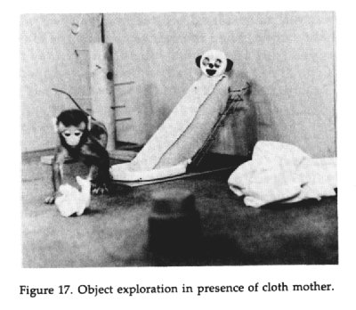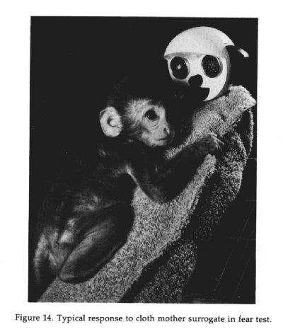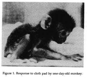 We had also discovered during some allied observational studies that a baby monkey raised on a bare wire-mesh cage floor survives with difficulty, if at all, during the first five days of life. If a wire-mesh cone is introduced, the baby does better; and, if the cone is covered with terry cloth, husky, healthy, happy babies evolve. It takes more than a baby and a box to make a normal monkey. We were impressed by the possibility that, above and beyond the bubbling fountain of breast or bottle, contact comfort might be a very important variable in the development of the infant's affection for the mother.