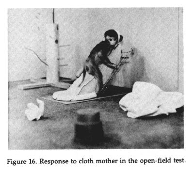 "open-field test") and containing multiple stimuli known to elicit curiosity-manipulatory responses in baby monkeys. The subjects were placed in this situation twice a week for eight weeks with no mother surrogate present during alternate sessions and the cloth mother present during the others. A cloth diaper was always available as one of the stimuli throughout all sessions. After one or two adaptation sessions, the infants always rushed to the mother surrogate when she was present and clutched her, rubbed their bodies against her, and frequently manipulated her body and face. After a few additional sessions, the infants began to