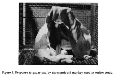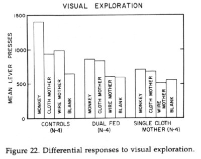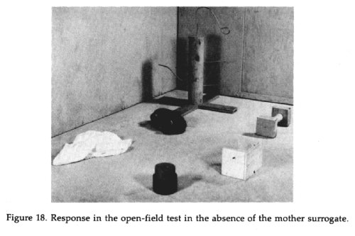The only exception was the occasional monkey that left the mother surrogate momentarily, grasped the folded piece of paper (one of the standard stimuli in the field), and brought it quickly back to the mother. It appeared that deprivation had enhanced the tie to the mother and rendered the contact-comfort need so prepotent that need for the mother overwhelmed the exploratory motives during the brief, three-minute test sessions. No change in these behaviors was observed throughout the 185-day period. When the mother was absent from the open field, the behavior of the infants was similar in the initial retention test to that during the preseparation tests; but they tended to show gradual adaptation to the open-field situation with repeated testing and, consequently, a reduction in their emotionality scores.