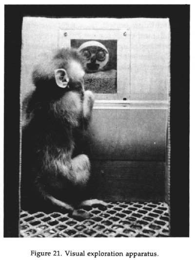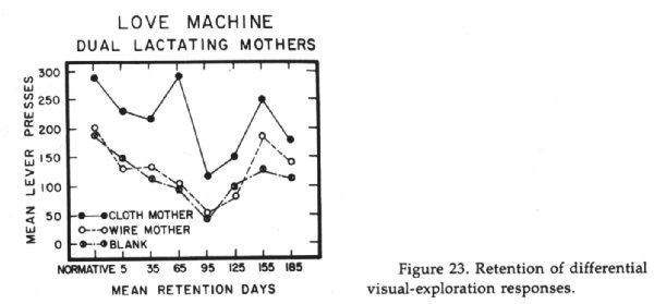 Some years ago Robert Butler demonstrated that mature monkeys enclosed in a dimly lighted box would open and reopen a door hour after hour for no other reward than that of looking outside the box. We now have data indicating that neonatal monkeys show this same compulsive visual curiosity on their first test day in an adaptation of the Butler apparatus which we call the "love machine," an apparatus designed to measure love. Usually these tests are begun when the monkey is 10 days of age, but this same persistent visual exploration has been obtained in a three-day-old monkey during the first half-hour of testing. Butler also demonstrated that rhesus monkeys show selectivity in rate and frequency of door-opening to stimuli of differential attractiveness in the visual field outside the box. We have utilized this principle of response selectivity by the monkey to measure strength of affectional responsiveness in our infants in the baby version of the Butler box. The test sequence involves four repetitions of a test battery in which four stimuli -- cloth mother, wire mother, infant monkey, and empty box -- are presented for a 30-minute period on successive days. The first four subjects in the dual mother-surrogate group were given a single test sequence at 40 to 50