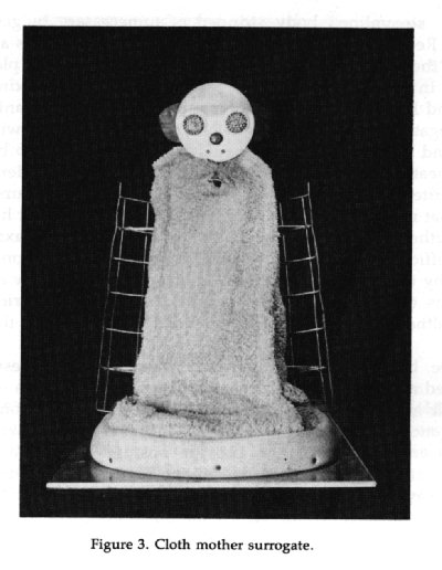 operator. The surrogate was made from a block of wood, covered with sponge rubber, and sheathed in tan cotton terry cloth. A light bulb behind her radiated heat. The result was a mother, soft, warm, and tender, a mother with infinite patience, a mother available twenty-four hours a day, a mother that never scolded her infant and never struck or bit her baby in anger.