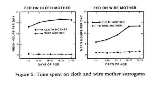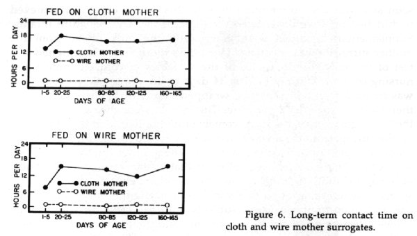 We were not surprised to discover that contact comfort was an important basic affectional or love variable, but we did not expect it to overshadow so completely the variable of nursing; indeed; indeed, the disparity is so great as to suggest that the primary function of nursing as an affectional variable is that of insuring frequent and intimate body contact of the infant with the mother. Certainly, man cannot live by milk alone. Love is an emotion that does not need to be bottle- or spoon-fed, and we may be sure that there is nothing to be gained by giving lip service to love.