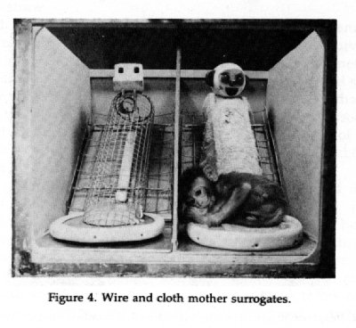 One control group of neonatal monkeys was raised on a single wire mother, and a second control group was raised on a single cloth mother. There were no differences between these two groups in amount of milk ingested or in weight gain. The only difference between the two groups lay in the composition of the feces, the softer stools of the wire-mother infants suggesting psychosomatic involvement. The wire mother is biologically adequate but psychologically inept.